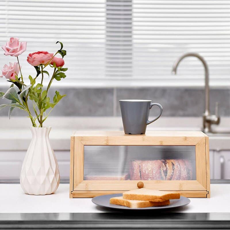 The bread box is constructed from bamboo, which makes it strong and durable. The natural finish of the bread box blends well with other accessories in the kitchen. For easy access, the bread box has a convenient door with a knob and a baseboard that can be pulled out. It helps protect the bread from heat and sunlight. When required, you can wipe it clean with a mild cloth to keep it looking as good as new for a long time.